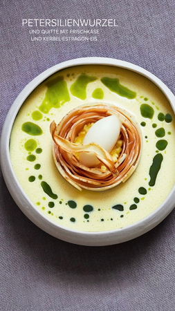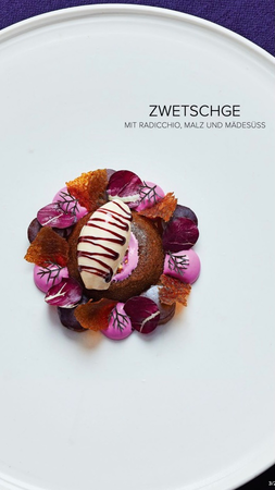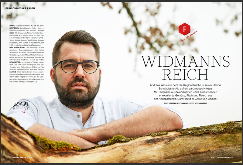 Andreas Widmann ist fest in der Heimat verankert und bezieht seine Inspirationen sowie die meisten Zutaten von einem Netzwerk engagierter Produzenten aus der Region: Zander kommt mit Kopfsalat, Mohn und Meerrettich auf den Teller, der Kürbis mit Kombucha und fermentiertem, schwarzem Knoblauch. Ein Hähnchen aus ökologischer Haltung hat Mais und Liebstöckel als Begleiter. Die Gerichte wie das Dessert mit Apfelragout, Wacholder-Rahmeis und geröstetem Buchweizen, das sich unter einer mit Blüten, Blättern und farbigem Gel verzierten Baiserkugel verbirgt, sind oft spektakulär in Szene gesetzt. Aromen und der Geschmack sind stimmig und ergänzen sich.