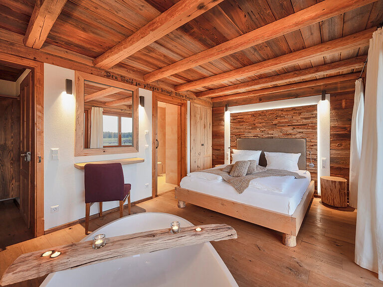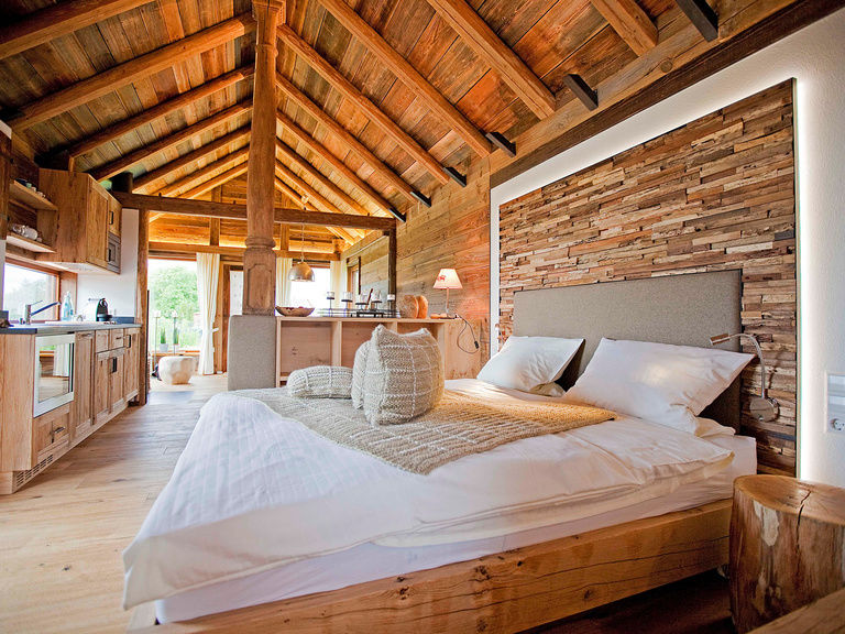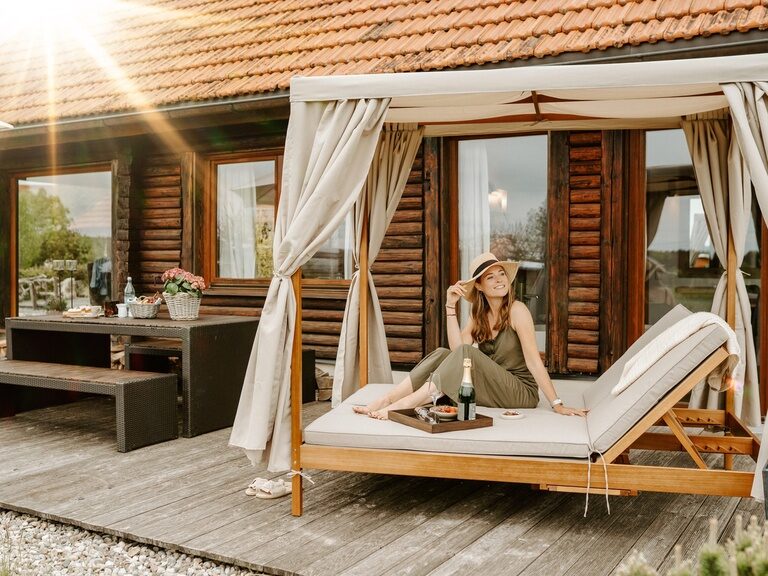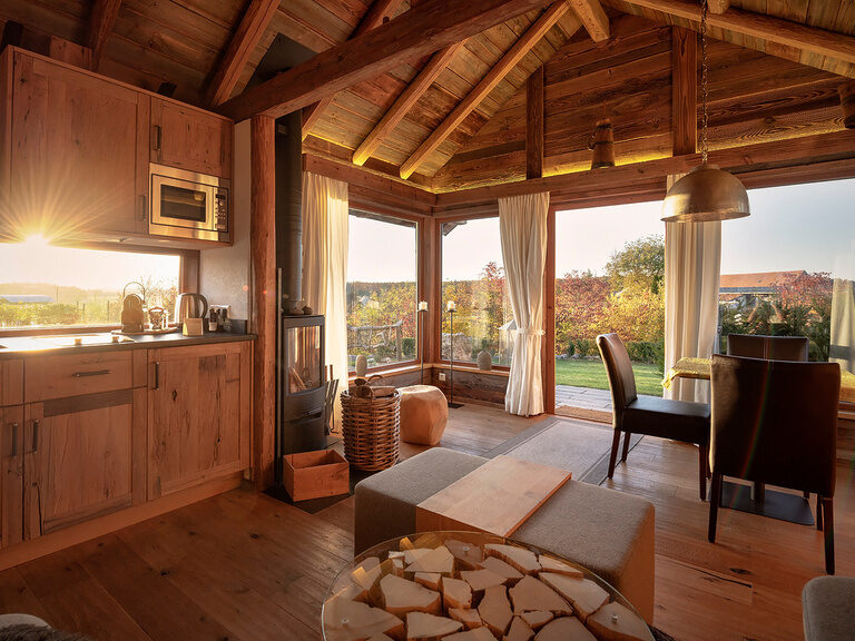 Unsere Chalets verfügen über eine private Sauna, einen gemütlichen Kaminofen, eine kleine Küchenzeile und bieten exklusiven Komfort in idyllischer Umgebung.